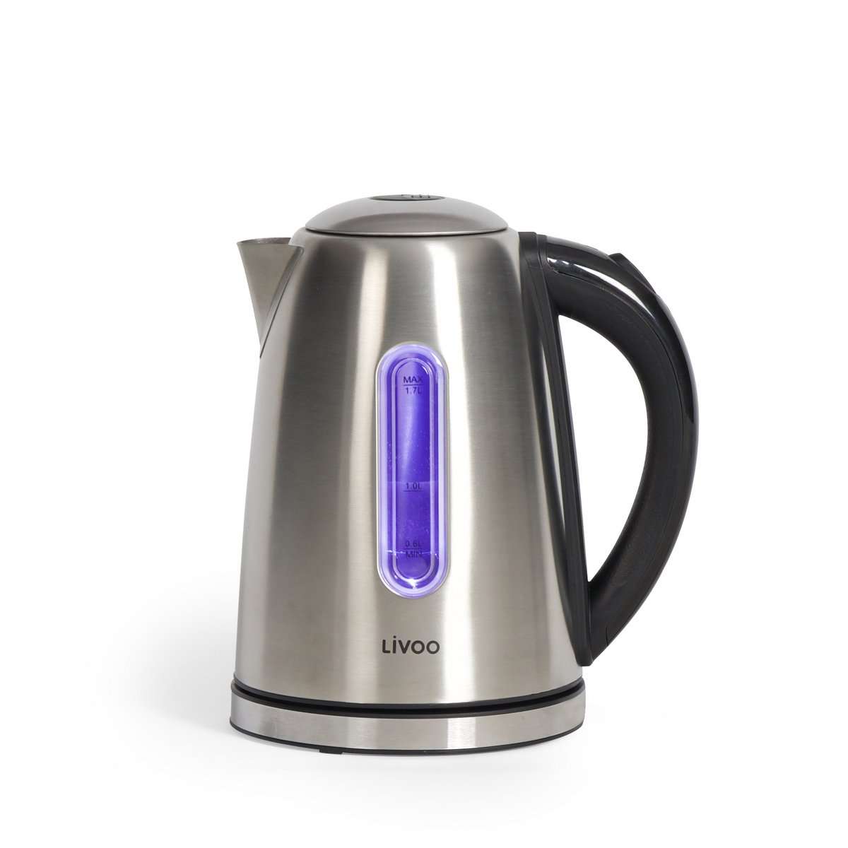 Ein drahtloser Wasserkocher 1700ml mit automatischer Abschaltung von Livoo. Er hat einen Überhitzungsschutz und einen 360 Grad drehbaren Sockel. Außerdem hat er eine blaue LED-Hintergrundbeleuchtung im Inneren.
