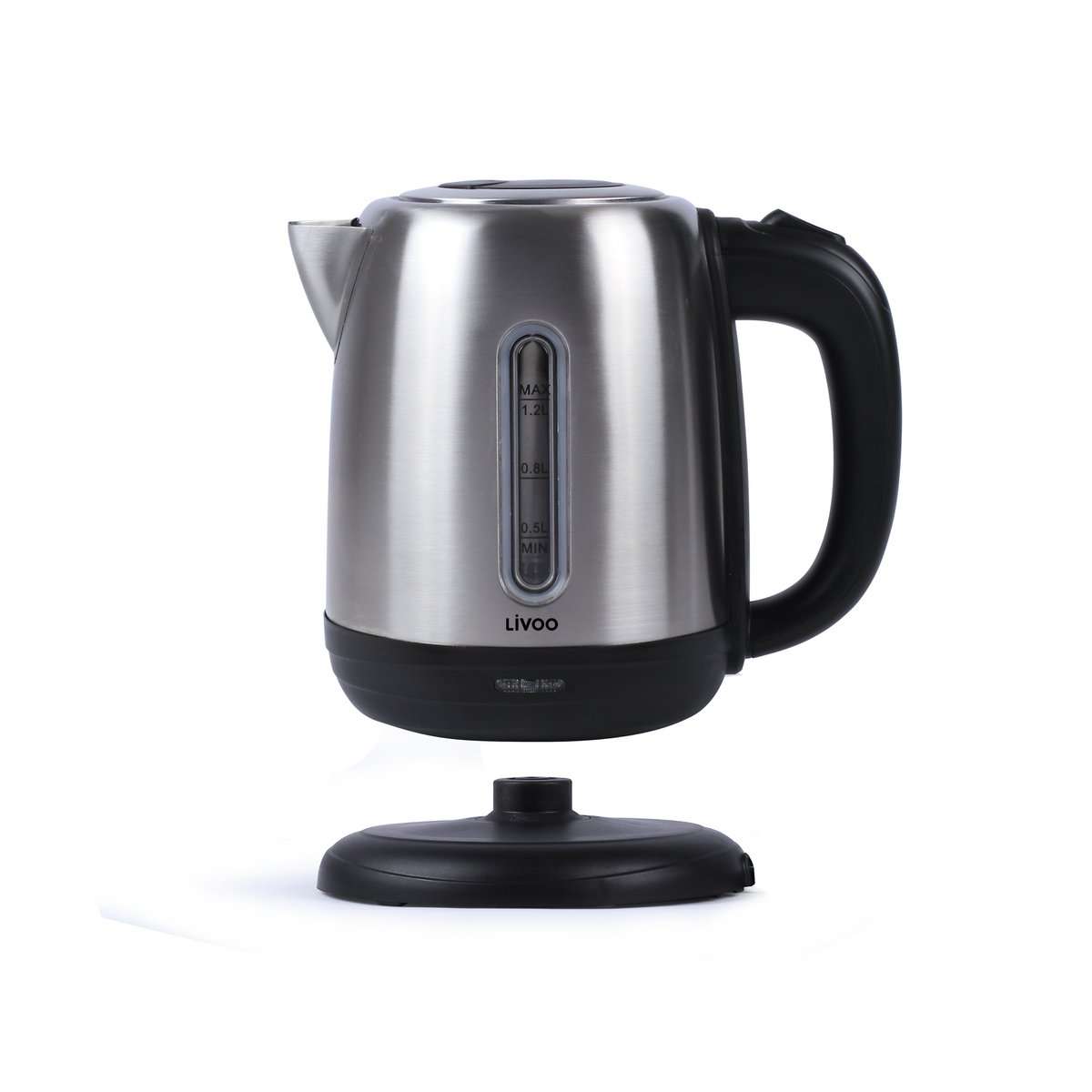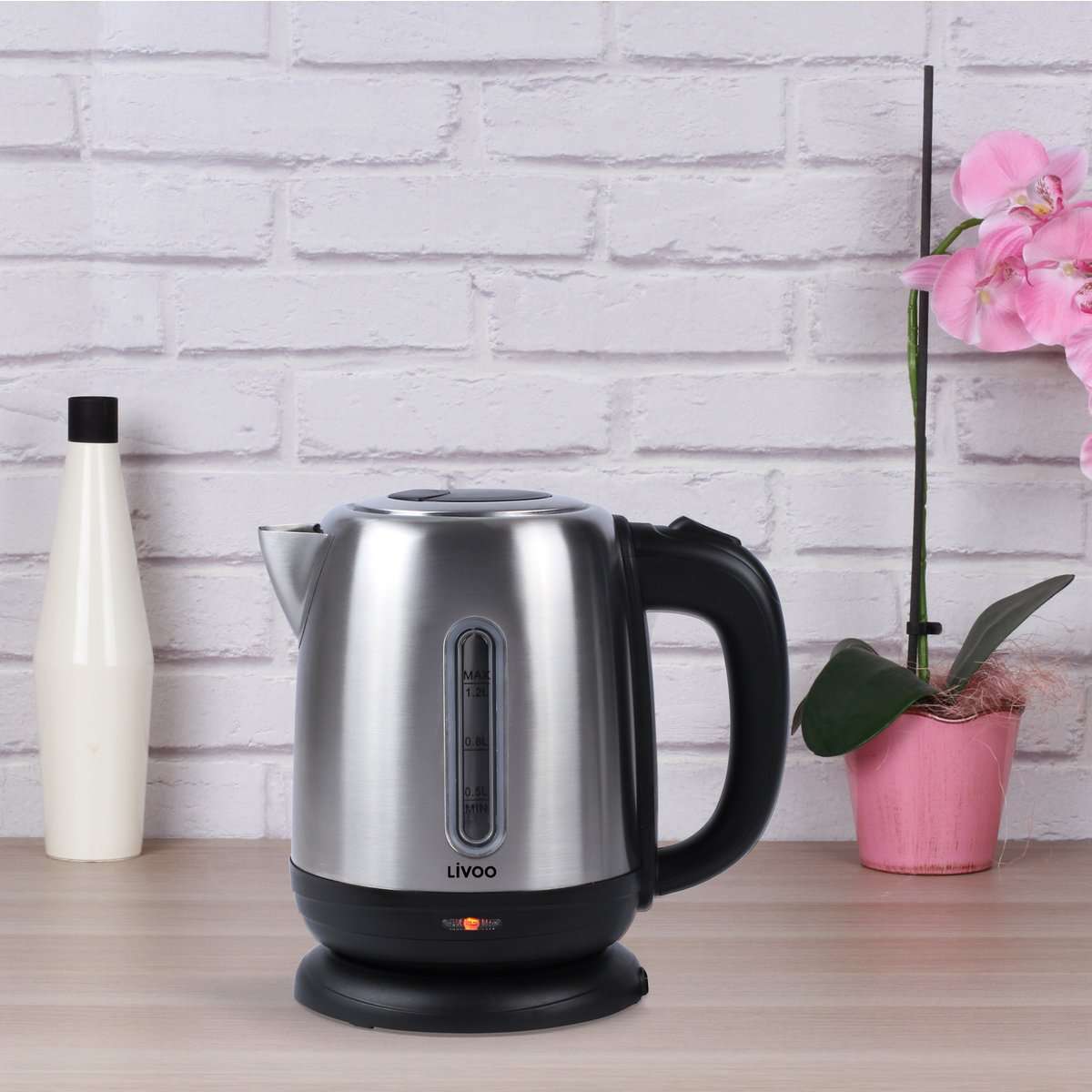 Ein elektrischer Wasserkocher 1200ml mit Wasserstandsanzeige und 360 Grad drehbarem Sockel von Livoo. Er hat eine automatische Abschaltung und einen herausnehmbaren Kalkfilter.