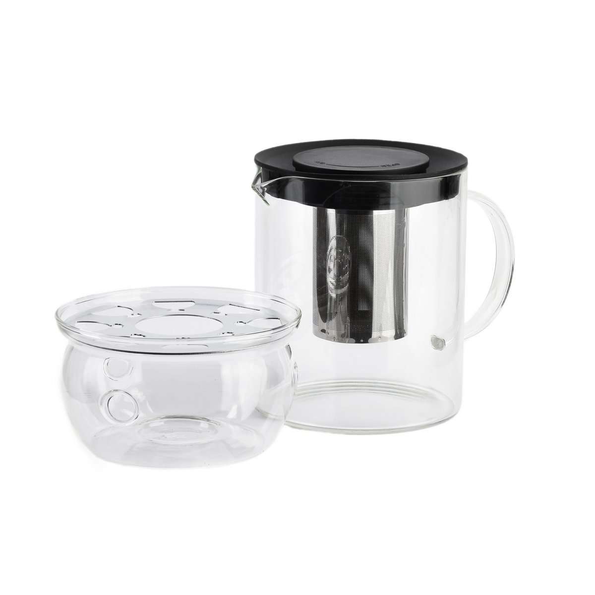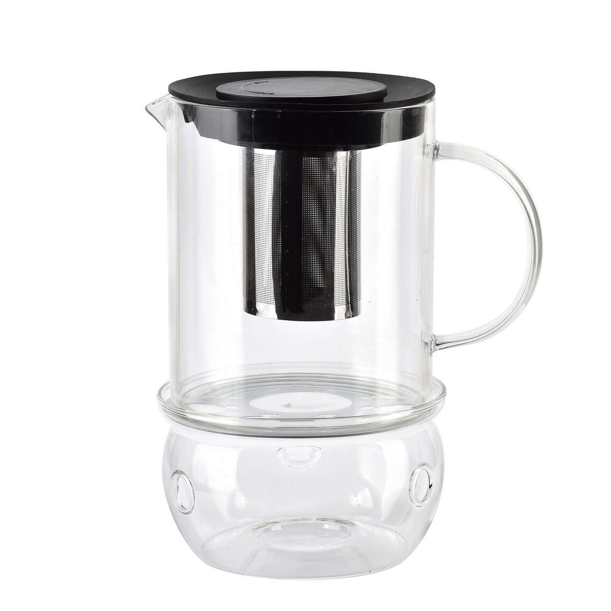 Eine Teekanne mit Stövchen aus Glas 1100ml für losen Tee und Kräuter von Cookini. Sie hat einen eigenen Filter und ein eigenes Stövchen. Damit kann der Tee länger warm gehalten werden.