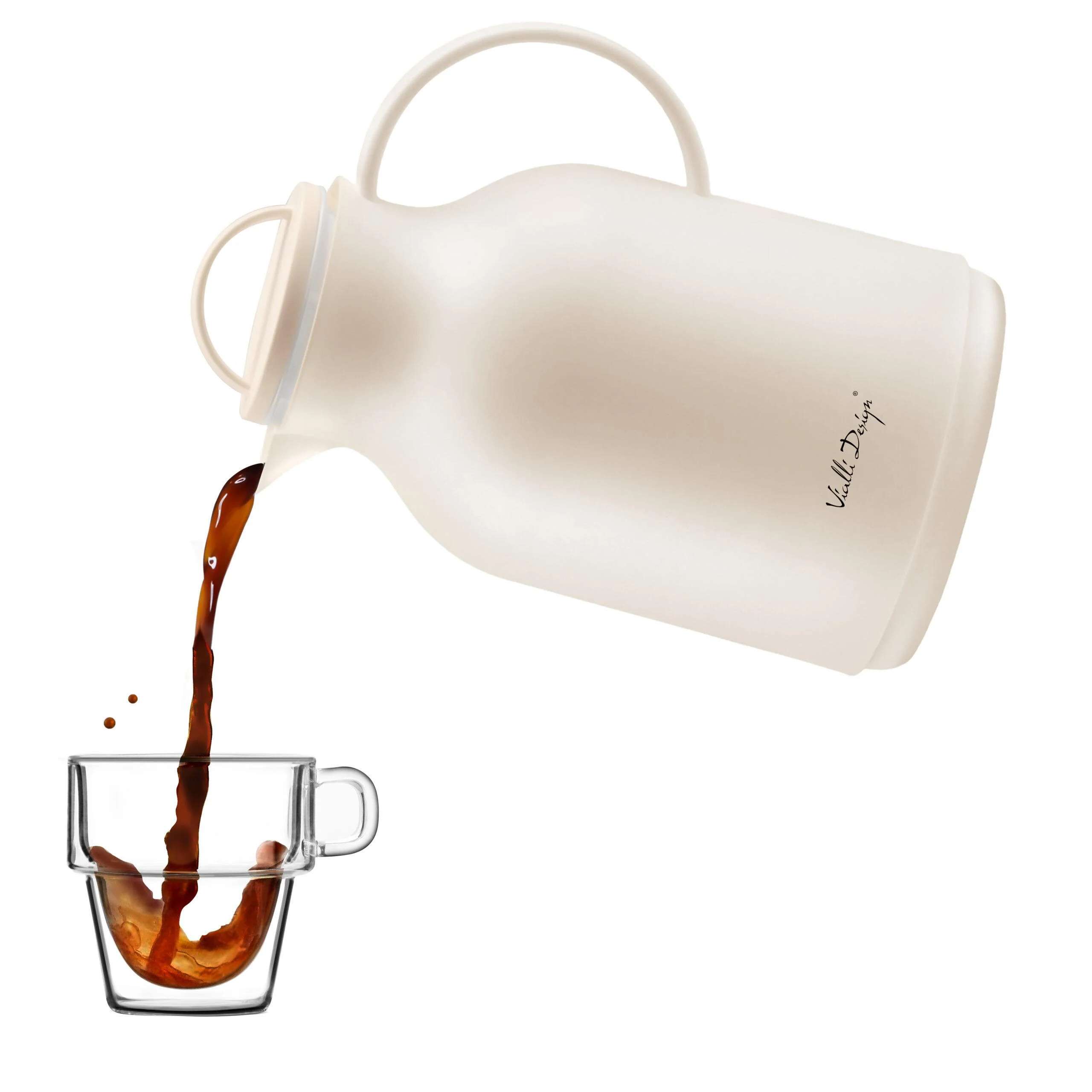 Eine Thermoskanne Glaseinsatz 1L für heiße und kalte Getränke von Vialli-Design. Der doppelte Glaseinsatz mit Vakuum zwischen dem Glas hält für bis zu 24 Stunden die Temperatur. Kein Kondensieren bei kalten Getränken und kein Erwärmen der Kanne bei heißen Getränken. In 2 Farben erhältlich – creme und schwarz.