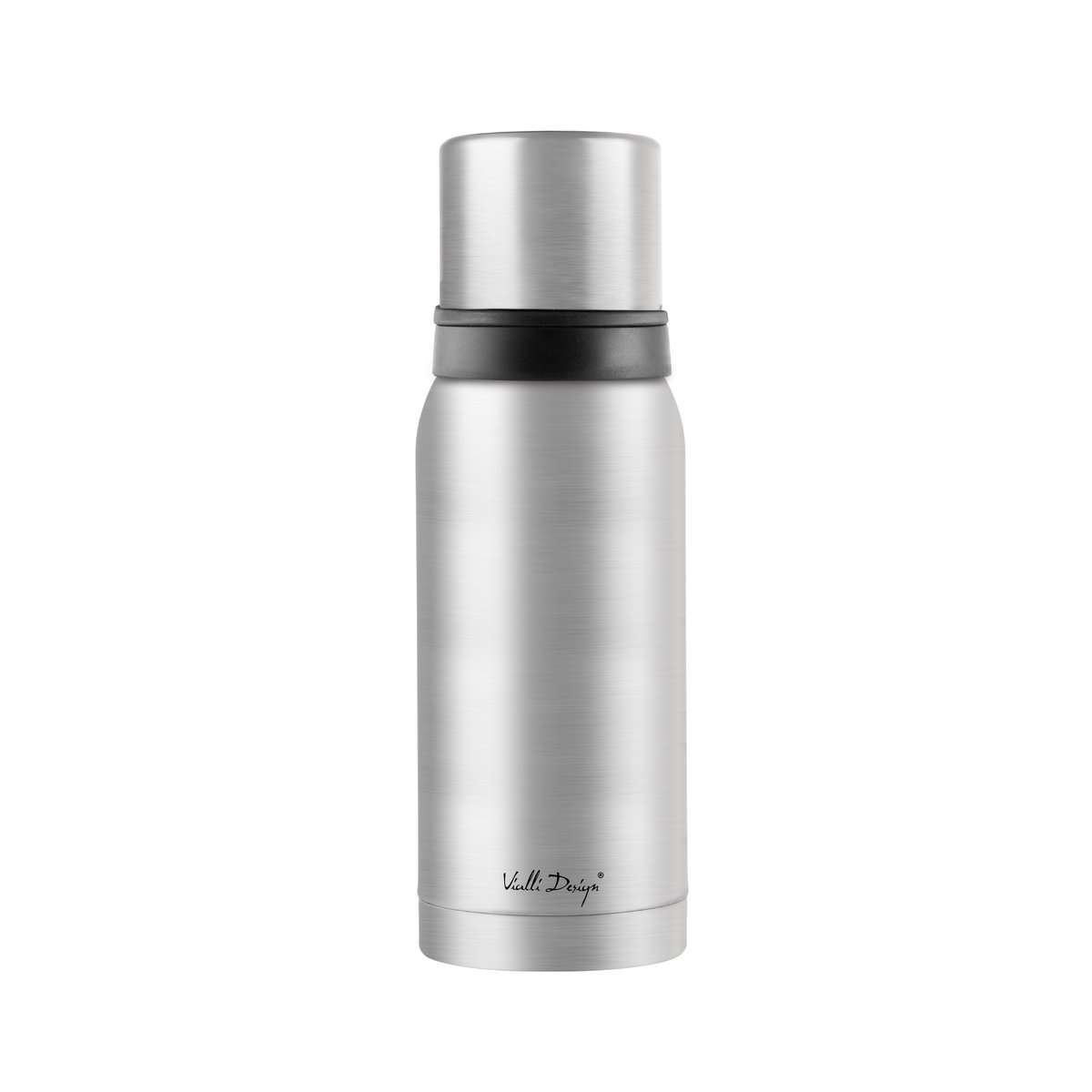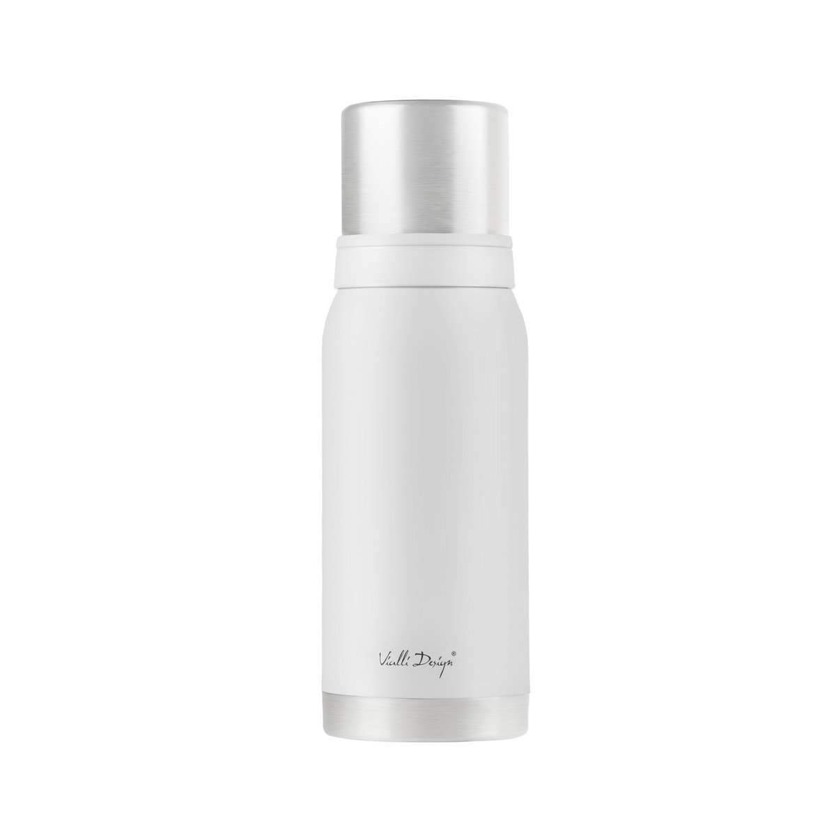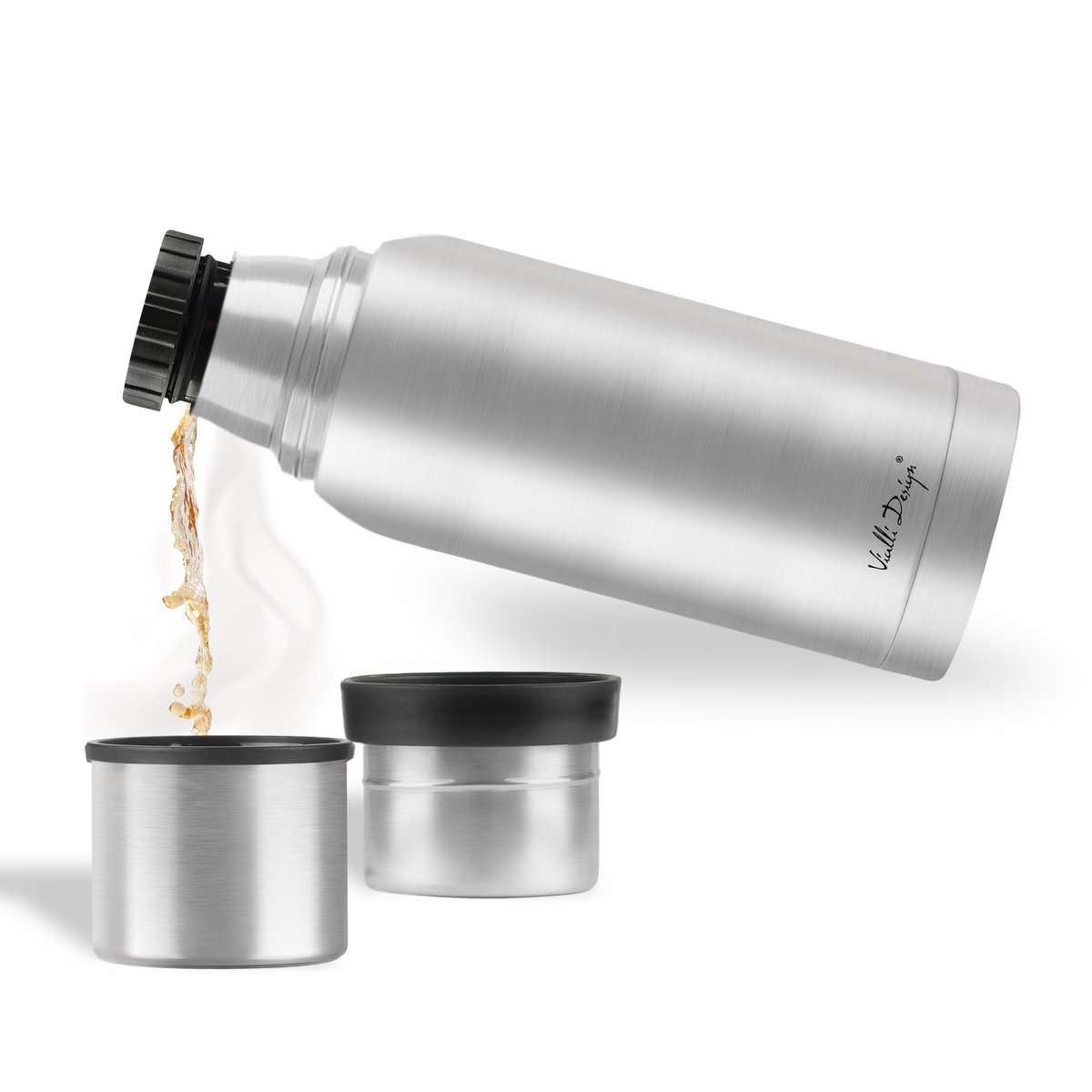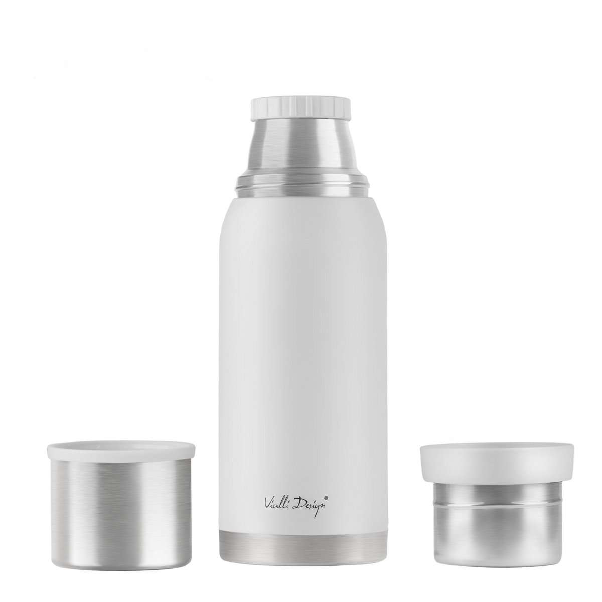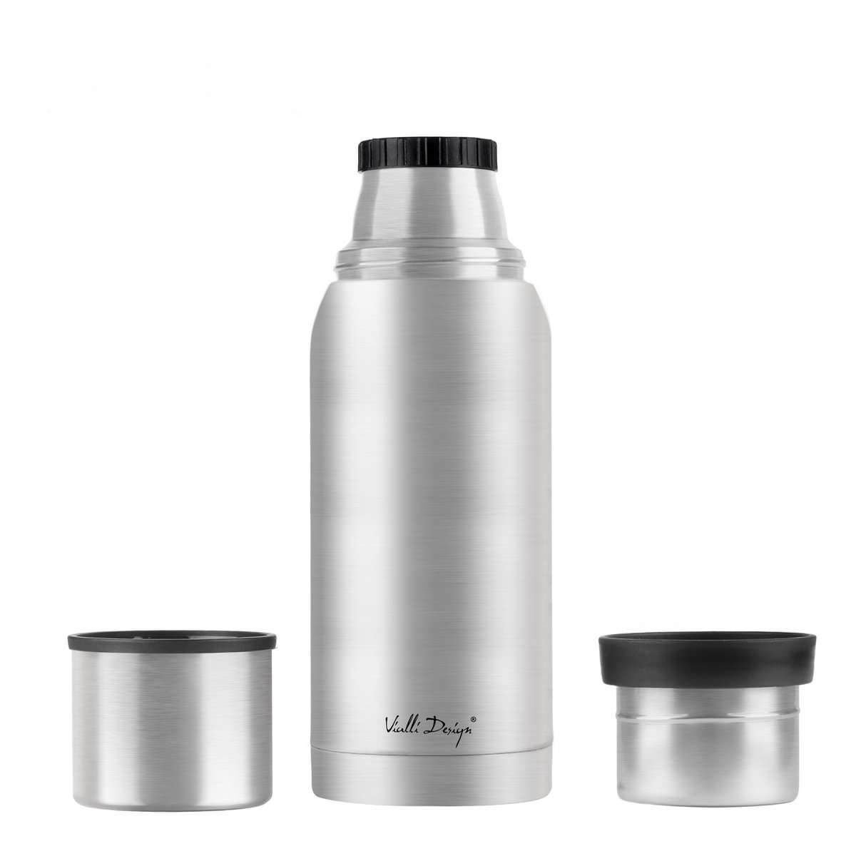 Eine Thermoskanne mit 2 Bechern 1000ml ideal für Reisen und outdoor von Vialli-Design. Sie hat einen Deckel, der aus 2 Bechern besteht – 150ml und 200ml. Eine Vakuumisolierung aus Stahl hält die Temperatur bis zu 24 Stunden. Sie ist in 2 Farben erhältlich – stahl matt und weiß.