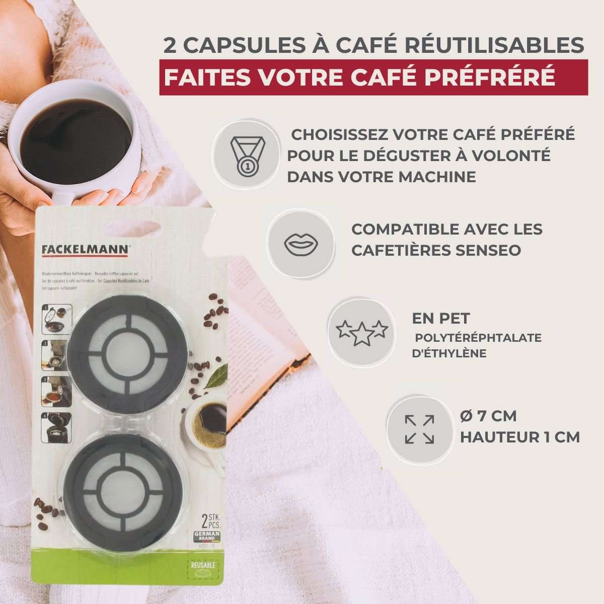 Ein 2er Set wiederverwendbare Kaffeekapseln für Espressomaschinen in Kapselform von Fackelmann. Sie sind wiederverwendbar und mit der Senseo Maschine kompatibel.